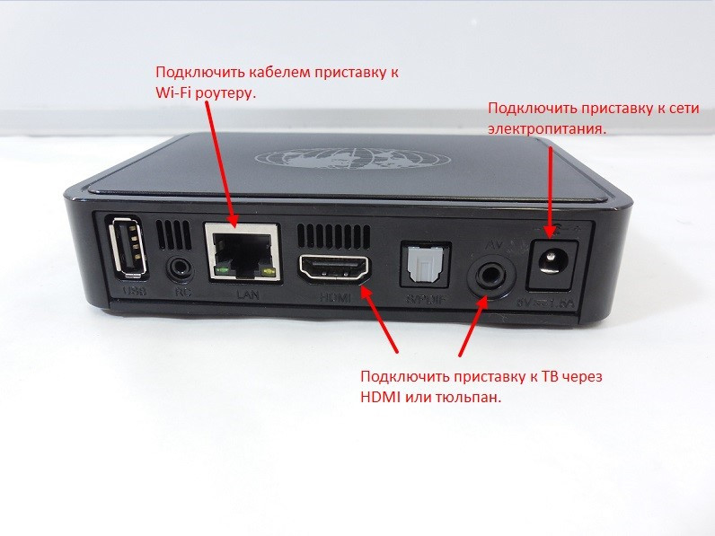 Подключение приставки производится по указанной ниже схеме – адаптер питания 220В вставляется в круглый разъем 5V-1,5A; кабель от Wi-Fi маршрутизатора подключается в прямоугольный разъем LAN. К Телевизору приставка подключается или через HDMI кабель (прямоугольный разъем HDMI), или через тюльпан (круглый разъем AV).