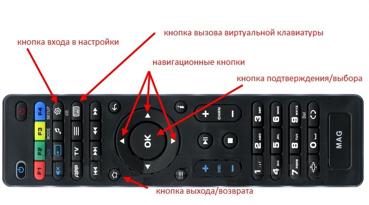 После этого необходимо ввести указанные на картинке внизу данные. Для перемещения между строками используем навигационные кнопки, ввод данных осуществляется с помощью виртуальной клавиатуры (кнопка в виде клавиатуры, на пульте находится под кнопкой входа в настройки). После ввода всех данных нажимаем кнопку ОК для сохранения.