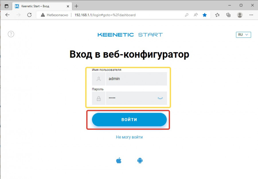 • В открывшемся окне введите имя пользователя admin и пароль, который вы создали в предыдущем шаге в соответствующие поля. Нажмите кнопку «Войти». Если забудете пароль, необходимо роутер сбросить до заводских настроек и начать настройку заново.