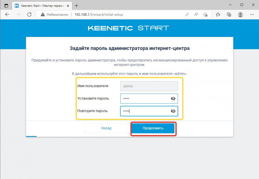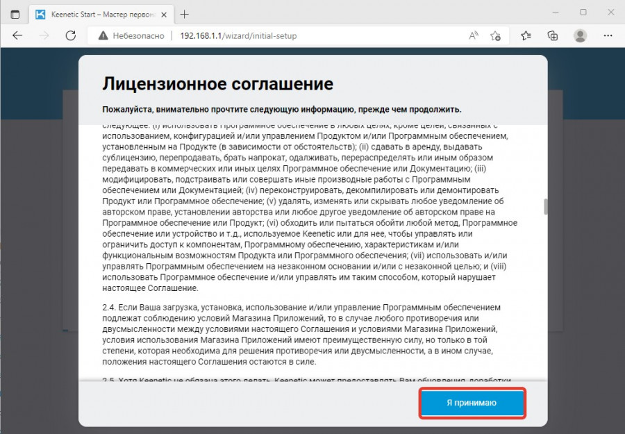 • Перед вами откроется окно Лицензионного соглашения, изображённое на рисунке ниже. Необходимо нажать кнопку «Я принимаю» Для входа в интерфейс роутера необходимо придумать пароль администратора. В последующем этот пароль будет использоваться для входа в интерфейс. Придумайте пароль и нажмите «Продолжить».