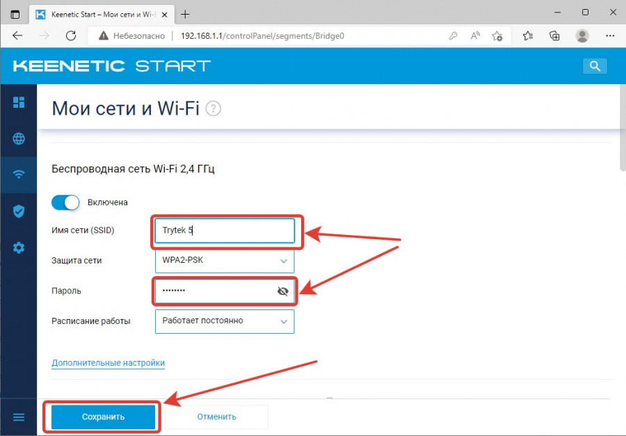 • В открывшемся окне необходимо придумать имя сети WI-FI и пароль. Далее нажать кнопку сохранить.