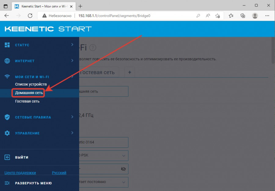 • Перед вами открылось окно настройки маршрутизатора. Перейдите в меню «Мои Сети и WI-FI». Далее «Домашняя сеть».