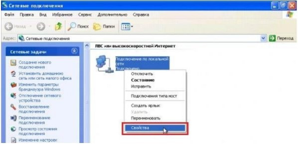 Подключение по кабелю – «Подключение по локальной сети», необходимо нажать правой кнопкой мыши на значок подключения и выбрать пункт «Свойства».