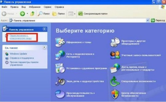 - Если вид открывшегося окна соответствует приведённому ниже, то слева необходимо выбрать «Переключение к классическому виду». В другом случае перейдите к шагу 3.