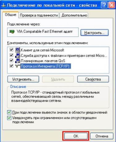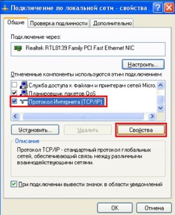 - На вкладке «Общие» необходимо выбрать пункт «Протокол Интернета (TCP/IP)» и нажать кнопку «Свойства».